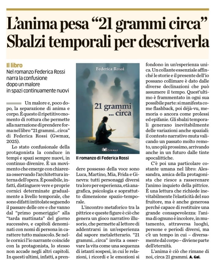 Dopo un malore, la protagonista cade in uno stato alterato e inizia un viaggio mentale che la trasposta in epoche e dimensioni diverse, dove si evoca la sottile linea che separa il corpo dall’anima, da questo “ventuno grammi” che rimanda al presunto peso dell’anima. Nei suoi sogni la protagonista incontra Luca, Martino, Frida ed altri personaggi, ognuno di loro con una storia diversa da raccontare.